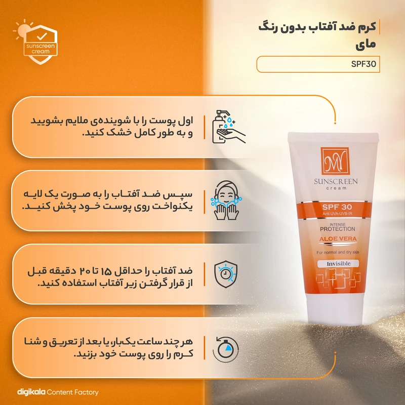 کرم ضدآفتاب مای SPF30 مدل بی رنگ از قدیمی ترین و پرفروش ترین کرم های ضد آفتاب های بازار ایران است که در گالری آرایشی امیر با بهترین قیمت تقدیم شما عزیزان می گردد. یک محصول محافظتی عالی برای انواع پوست است که توسط برند معتبر مای طراحی و تولید شده است. این کرم با داشتن محافظ UVA و UVB، محافظت کاملی از پوست در برابر اشعههای مضر خورشید فراهم میکند. همچنین، وجود عصاره آلوئهورا در ترکیبات این کرم، آن را به یک محصول مرطوبکننده و التیامبخش تبدیل کرده است. کرم ضدآفتاب مای برای استفاده روزانه مناسب است و به راحتی میتواند به بخشی از روتین مراقبت از پوست شما تبدیل شود.